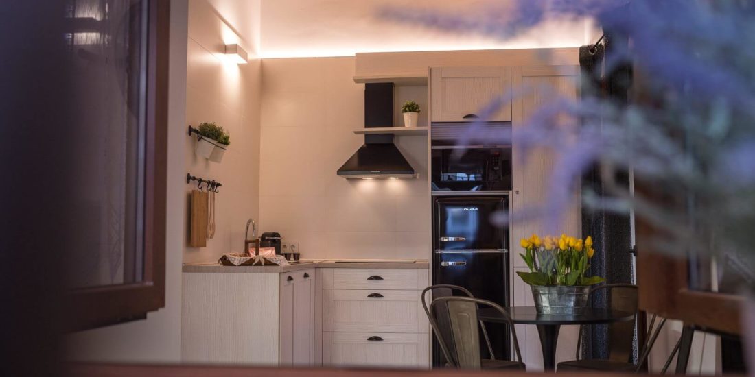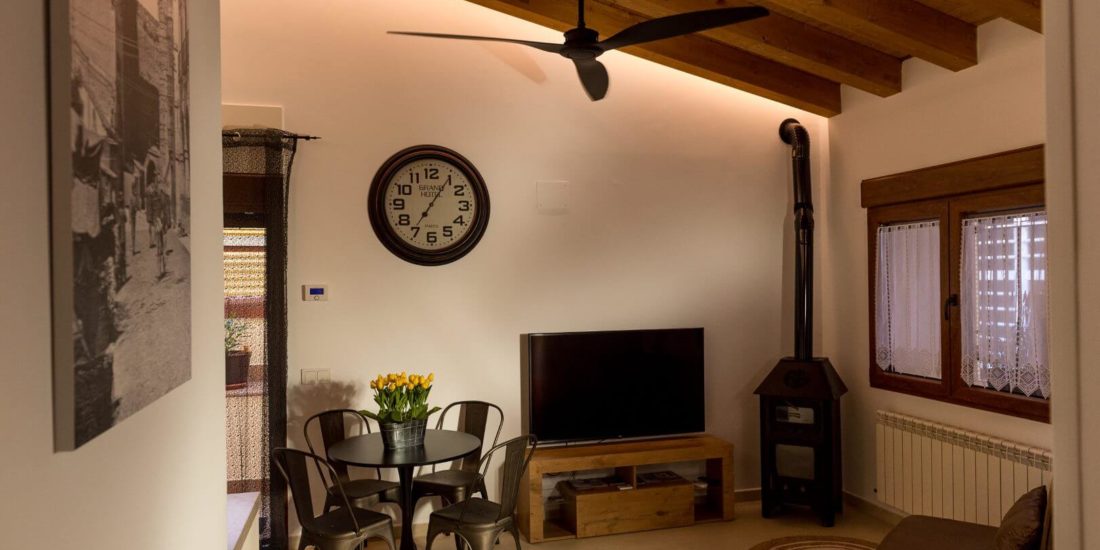 Lo más característico de la casa es la bonita iluminación interior LED que realza el magnífico techo de madera, así como el salón-comedor-cocina un espacio de 23 ms. muy bien decorado, cómodo y agradable, donde se distinguen la zona de estar con un precioso sofá, un sillón (cama) y la TV de 55” smart-tv y Neflix, además de una regia estufa de hierro fundido que da carácter a la casa. En el mismo espacio está la zona del comedor y una atractiva cocina con todo lo necesario para cualquier plan culinario. Esta zona cuenta con un magnífico ventilador de techo que garantiza la refrigeración.