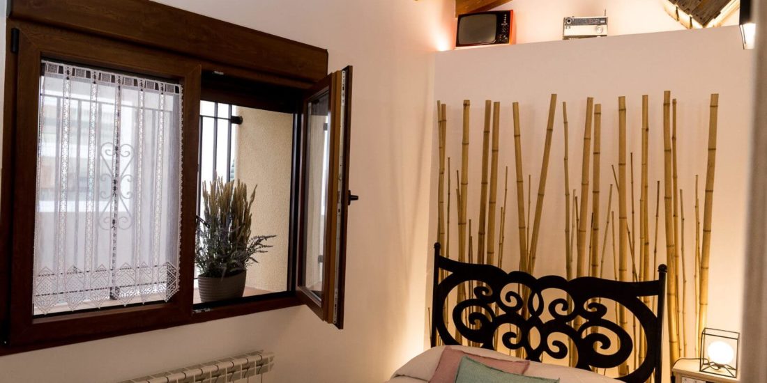 La casa cuenta con dos acogedores y originales dormitorios, el principal con una cama de 150 cm. de ancho y el otro con una cama de 120 cm. de ancho y 200 cm. de largo.