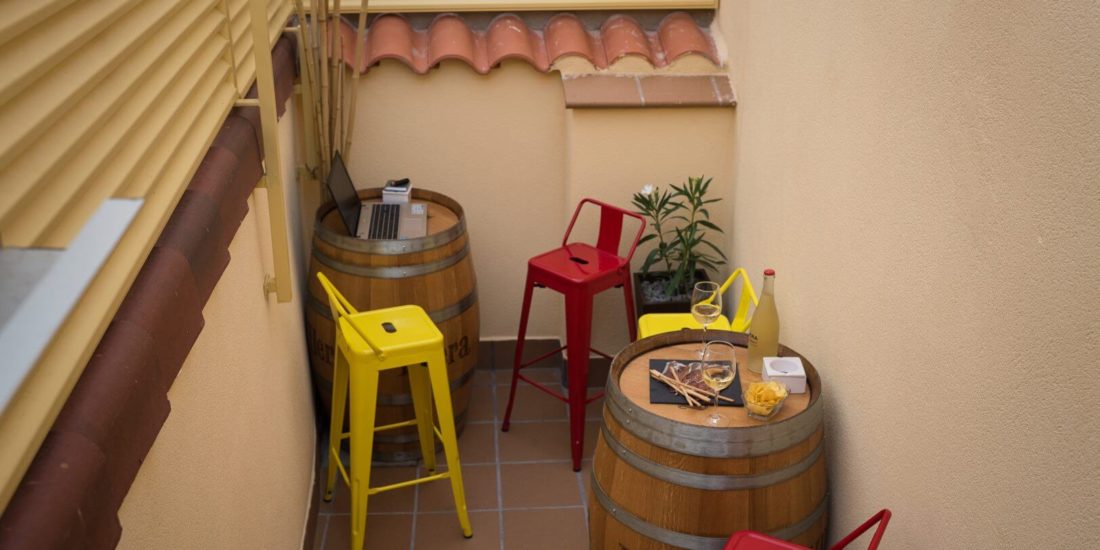 Desde el salón se accede a un pequeño patio orientado al sur y que tiene una divertida decoración con cubas de vino y banquetas, siendo ideal para tomar algo y charlar al aire libre.